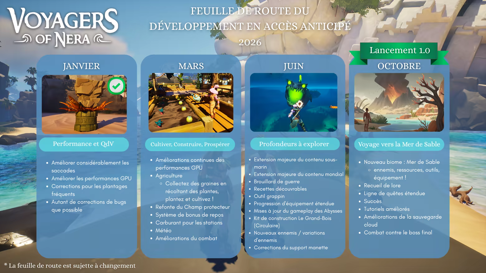 Notre conviction est que chaque grand jeu se construit grâce aux retours de ses joueurs, et nous organisons des phases de test toutes les deux semaines depuis la mi-2025. L’accès anticipé est pour nous une chance de recueillir les commentaires d’un nombre bien plus important de joueurs, ce qui nous aidera à améliorer plus encore notre jeu. Nous avons hâte de connaître votre avis via le système de sondage en jeu, sur Steam et sur notre serveur Discord. À toutes celles et ceux qui ont déjà joué, nous tenons à vous remercier pour le soutien et l’aide que vous nous avez apportés pour faire de Voyagers of Nera un meilleur jeu !